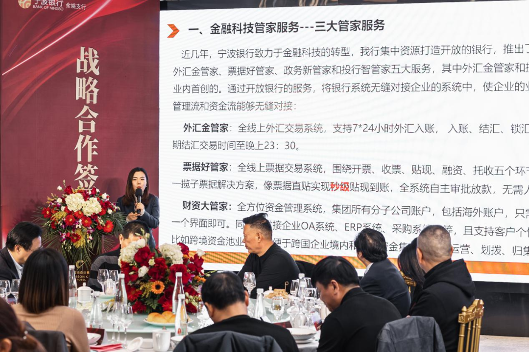 在本次签约仪式上,余姚支行私银部详细介绍了支行特色金融服务,以及协会专属定制方案,特别就上市企业服务方案作了重点介绍。